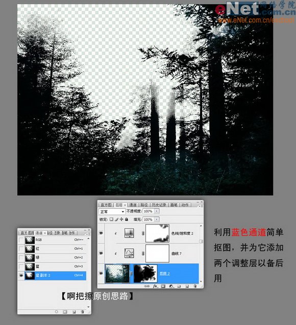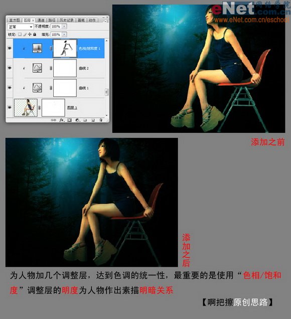 抠好后,把背景层打开,仔细看看人物哪些地方抠得不干净,我们可以在蒙版中使用黑白两种画笔交叉擦除(编者按:白色代表“保留”,黑色代表“去掉”),这样可以很自然地将人物层融入到背景当中去。然后为人物加几个调整层(为什么不用图像菜单下的调整呢,这是因为一旦执行了调整命令就很难返回原图的效果,如果失败了就得重做,而调整层的蒙版是我们可以再编辑的好东西),最后的“色相/饱和度”调整层是关键,使用它的“明度”设置,降低暗色,再用黑色画笔擦除受光部,这一步很多人都容易忽略,其实处理写实效果的图,一定要注意素描关系,哪怕只是细微的调整也会影响到最后的效果。