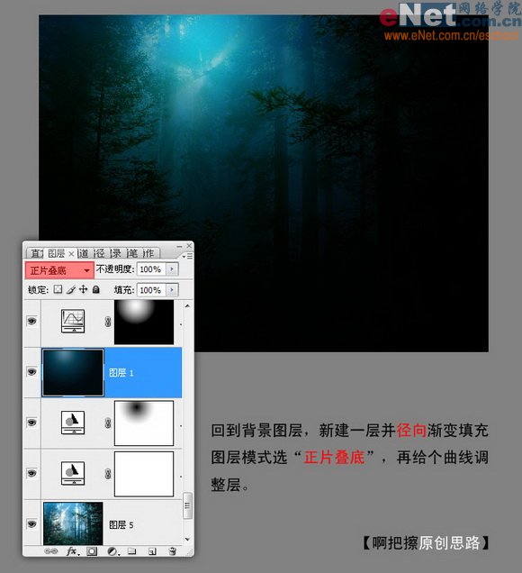 为了达到夜景效果,新建一层,用深蓝灰渐变填充,图层模式用“正片叠底”