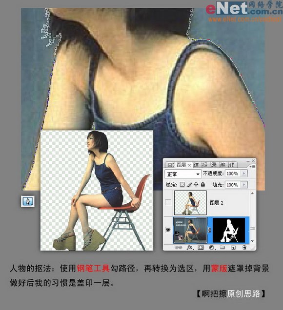 下面的工作比较繁杂,不过您如果跟着我慢慢做,也不是难事。我们就先来处理人物,当然了,你要先抠出人物,我抠人物一般喜欢使用钢笔,因为钢笔勾路径的可塑性很强,如果用其他方法的话,一旦抠失败了就得重来,而路径可以随时调整,所以我建议大家按这种方法来抠。
