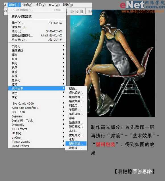 把人物层单独盖印一层(Ctrl Shift Alt E),然后执行“塑料包装”。这样做的目的是为了找到人物的高光部分,我不清楚别人是如何做的,但我习惯这样找高光部分。