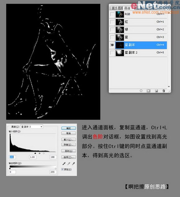 为了能精确地作出高光的选区,我们进入通道面板,复制蓝通道,打开色阶对话框,拉大黑白灰的对比,然后按住Ctrl键的同时点蓝通道副本,得到高光的选区。
