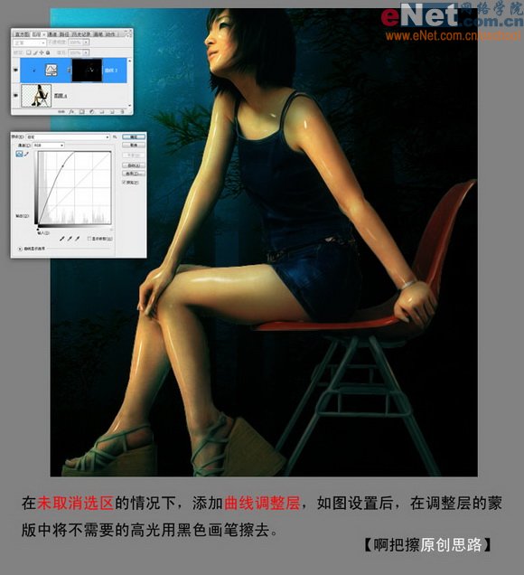 选区做好后,千万别取消选区,在人物层上添加一个曲线调整层,提亮高光区域。当然了有些没必要提亮的地方也会同时变亮,很好,我们的调整层不是有蒙版吗,用您的黑色画笔把不需要提亮的地方涂抹掉吧。