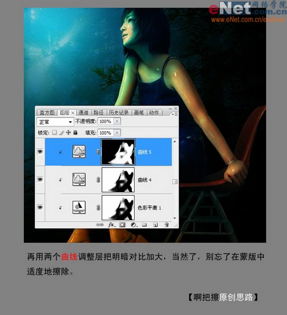 这时我们发现明暗的对比不够大,前面我们说过使用“明度”可以做出素描的明暗效果,其实“曲线”调整层也可以达到类似的效果,这次我们就用“曲线”来做,还是请您注意蒙版的涂抹。