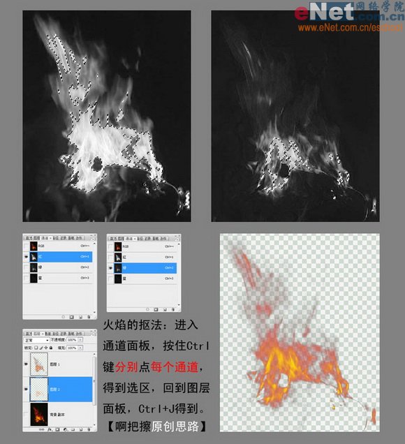 人物的调整就差不多了,下面我们再来做火焰的效果。火焰的抠法是相当简单的,直接进入通道面板,选择一个通道(无论是红通道还是绿通道都可以),直接按住Ctrl键的同时点其中的一个通道,得到选区,回到图层面板,Ctrl J复制选区的内容;按照这种方法做第二个通道的选区,然后还是回到图层面板,得到第二个选区的内容。最后的效果如下图所示(这里我舍弃了蓝色通道,因为蓝通道的色彩信息丢失太多,无法做出合适的选区),不过可能有人会问:为什么这么简单就可以抠出火焰呢?其实我们可以看出火焰的背景为纯黑色,而黑色和白色是没有色相的属性,所以无论背景是黑色还是白色,抠如火焰这样的高亮物体,是很容易的事情(在白色背景的情况下,选择绿色和蓝色通道来抠,红色通道的色彩信息在白色背景下几乎全部丢失)