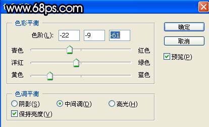 ⒌、创建一个图层,盖印图层,按CTRL B调色彩平衡,数值如下图。
