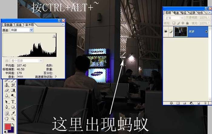 2、注意,绝招来了,图打开后,按CTRL ALT ~,~就是最左上角那个键,好了,现在图上出现选区蚂蚁,说明已经有部分东西存到选区了。