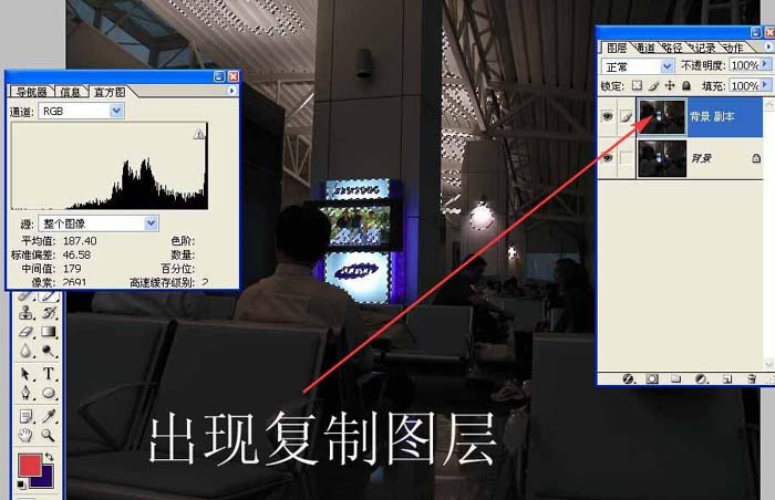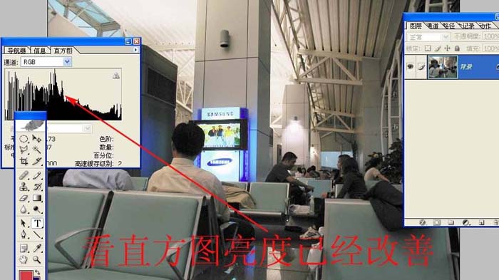 1、用PS打开图来看,这么大的光比,要想看到暗处,用调整亮度的办法是没希望了。