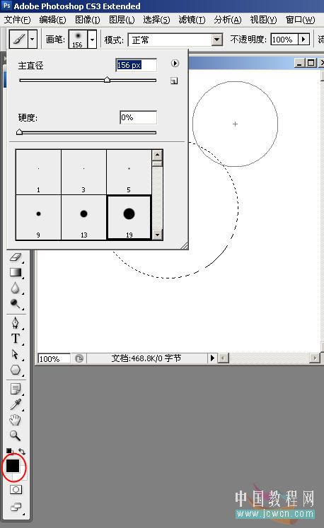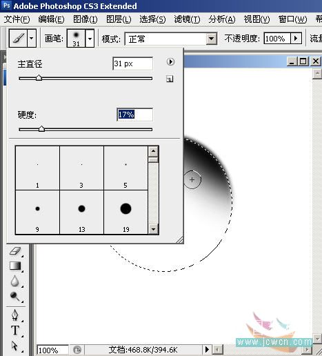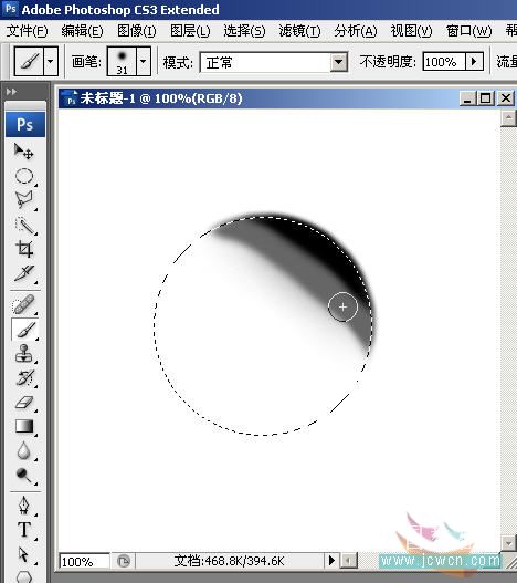 2,按D键复位前、背景色为默认的“黑、白”,选用软边画笔设置合适笔头大小