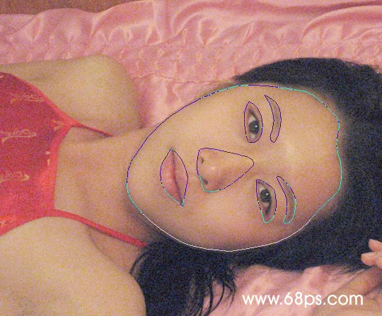 2.用钢笔工具勾出脸部选区,鼻子、眼睛、眉毛、嘴巴等地方也要勾出来如图4,按Ctrl Enter 转为选区,执行菜单:滤镜 > 模糊 > 高斯模糊 数值为4.5效果如图6。