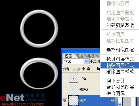 新建一个图层,命名为戒托。以同样方式再画一个规则的环形,并将指环的样式粘贴给它,方法为在图层面板右键点击指环层选择 “拷贝图层样式”后右键点击戒托图层选择“粘贴图层样式”。