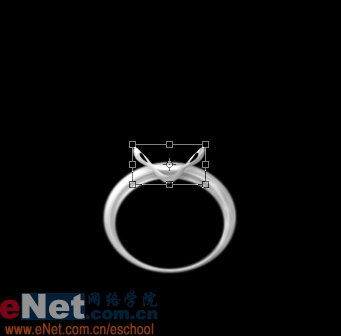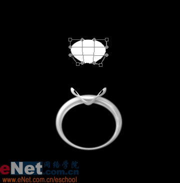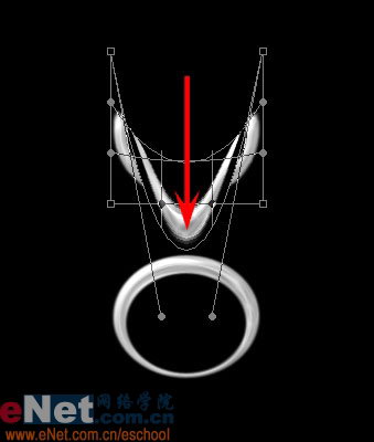 执行菜单/编辑/变换/变形(PS 9.0 以上版本才有),将红圈内的两个节点之间的一段路径向下拖动,到如下位置后Enter键确定即可。Ctrl T自由变换造形后的戒托到合适大小和形状,放在指环之上。