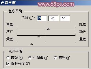 2.创建调整图层选择色彩平衡参数设置如图2,效果如图3