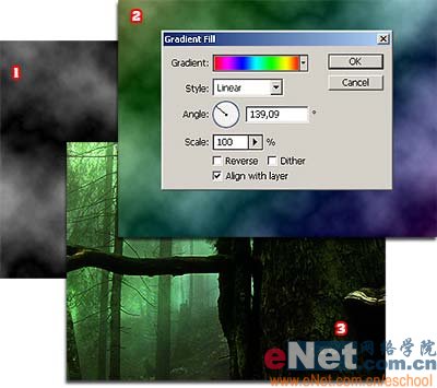 9.到这里整个照片的编辑已经进入尾声了,接下来我们还需要修饰一些细节部分,再处理加入一些光线。建立一新图层,设置前景色和背景色分别为白色和黑色。然后执行滤镜-渲染-云彩,然后用步骤二那样加入一个渐变填充调整层,渐变色还是用彩虹渐变色。在云彩图层上添加一个图层蒙版,在蒙版中填充黑色并将云彩图层的混合模式设置为颜色减淡(Color Dodge)。现在再将前景色设置为白色在云彩层的图层蒙版中用白色的画笔涂出我们需要的部分颜色,如下图所示: