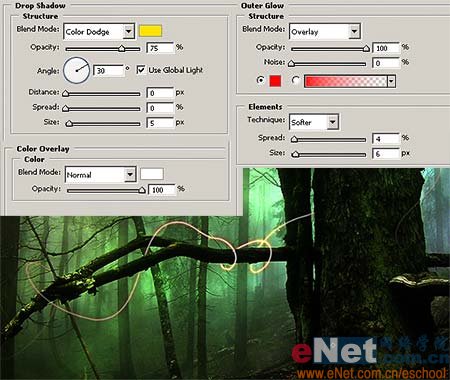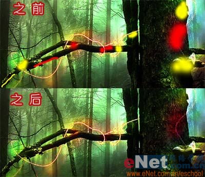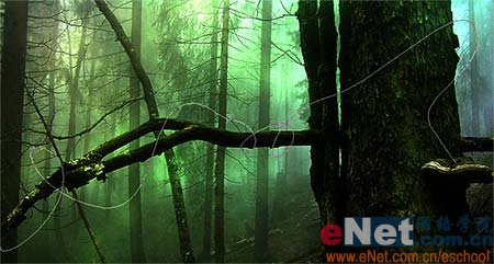 5.在执行完路径描边命令后,用橡皮工具擦除一些线条中多余的部分。是光线看上去是像是缠绕在树干上的样子,如下图所示: