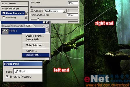 4.建立一个新图层,用画笔工具选择小一些的画笔并将画笔的颜色设置为白色。然后打开画笔预设调板勾选动态形状,设置最小直径为15%。然后回到路径面板,右击鼠标选择描边路径。请务必勾选描边路径中的模拟压力选项,如下图所示: