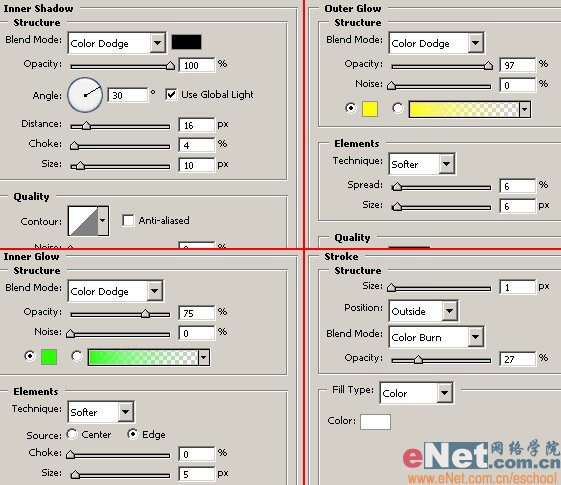 7.再给以上图层加入图层样式,分别为内阴影,内发光,外发光,描边,设置如下图所示: