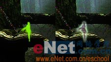11.在“小精灵”层下建立一个新图层,填充黑色并设置图层混合模式为亮度(Lighten)。接下来执行滤镜-渲染-光照效果,将光晕点移动到小精灵的位置处,然后用橡皮工具擦除一些多余的光晕。如下图所示: