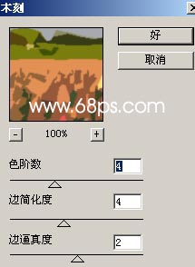 2.执行菜单:滤镜 > 艺术效果 > 木刻参数设置如图2,确定后把图层混合模式改为“强光”,效果如图3