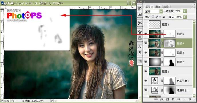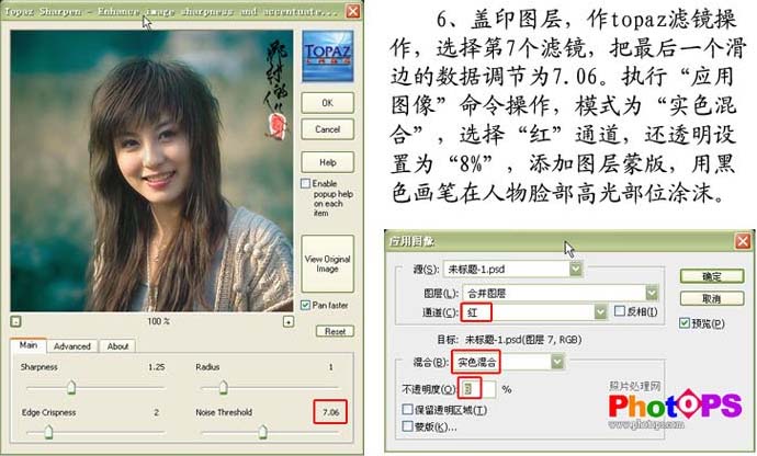 6.盖印图层,使用Topaz滤镜,把最后一个滑边的数据调节为7.06。执行“应用图象”命令操作,模式为“失色混合”,选择“红”通道不透明度设置为“8%”,添加图层蒙版,用黑色画笔在人物脸部高光部位涂抹。