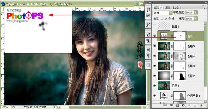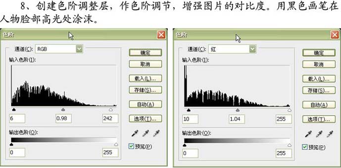 8.创建色阶调整层,做色阶调节,增强图片的对比度。用黑色画笔在人物脸部高光处涂抹。