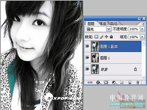 步骤4 回到图层1副本 把小眼睛打开 选择 强光photoshop,
