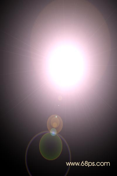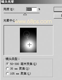 3.新建一个图层填充为黑色,执行菜单:滤镜 > 渲染 > 镜头光晕,参数设置如图4,确定后选择菜单:编辑 > 变换 > 垂直反转,再适当的拉大一点效果如图5,再把图层混合模式改为“颜色加深”,图层不透明度改为:50%,效果如图6