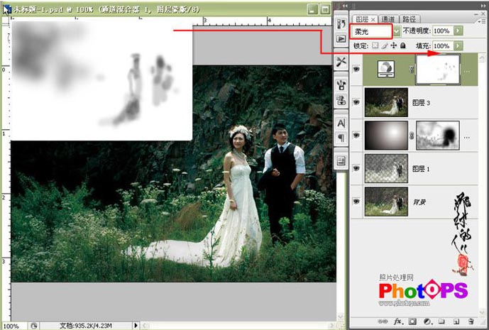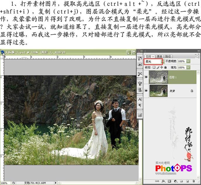 1.打开素材图片,提取高光选区(Ctrl Alt ~),按Ctrl Shift I反选,按Ctrl J复制,图层混合模式改为“柔光”。经过这一不操作,灰蒙蒙的图片得到了改观,为什么不直接复制一层而进行柔光模式了,大家可以去多试一下。