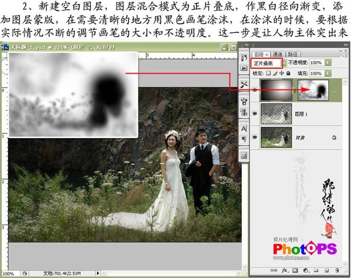 2.新建空白图层,图层混合模式改为“正片叠底”,做黑白径向渐变,添加图层蒙版,在需要清晰的地方用黑色画笔涂抹,在涂抹的时候,要耕具实际情况不断的调节画笔的大小和不透明度。