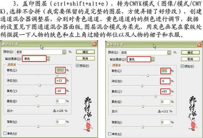 3.盖印图层(Ctrl Shift Alt E),转为CMYK模式(图像/模式/CMYK),选择不合并,创建通道混合器调整层,分别对青色通道、黄色通道的颜色进行调节,数据的设置见下图通道混合器面版,图层混合模式改为“柔光”,用灰色画笔在蒙版处稍微提一下人物的肤色和左上角过暗的部位以及人物的裙子和衣服。