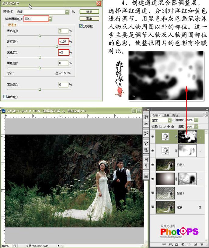 4.创建通道混合器调整层,选择洋红通道,分别对洋红和黄色进行调节。用黑色和灰色画笔涂抹人物及人物周围以外的部位。这一步主要是调节人物及人物周围部位的色彩。使整张图片的色彩用冷暖对比