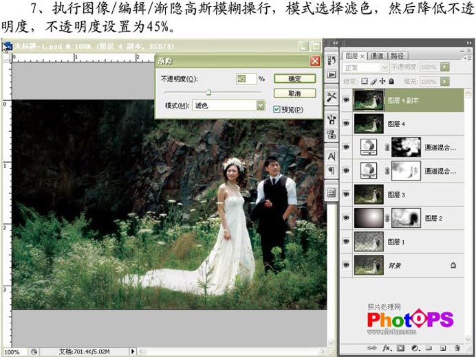 7.执行图像/编辑/渐隐高斯模糊操作,模式选择滤色,然后降低不透明度,不透明度设置为45%