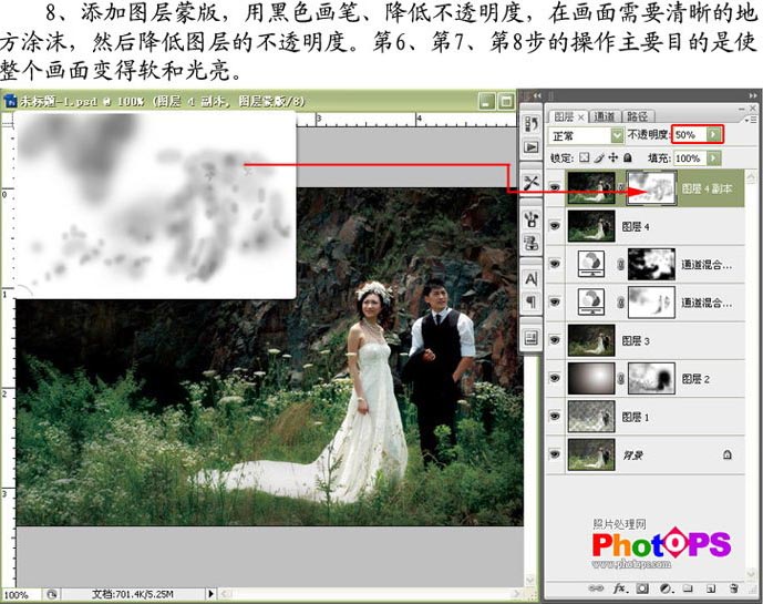 8.添加图层蒙版,用黑色画笔、降低不透明度,在画面需要清晰的地方涂抹,然后降低图层的不透明度。第6、第7、第8步的操作主要目的是使整个画面变得柔和光亮。
