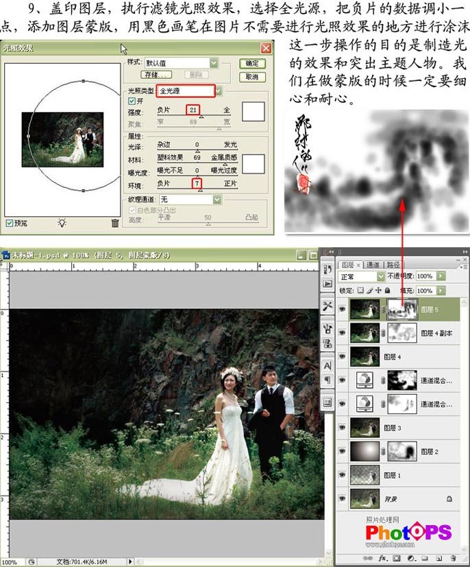 9.盖印图层,执行滤镜光照效果,选择全光源,把负片的数据调小一点,添加图层蒙版,用黑色画笔在图片不需要进行光照效果的地方进行涂抹。