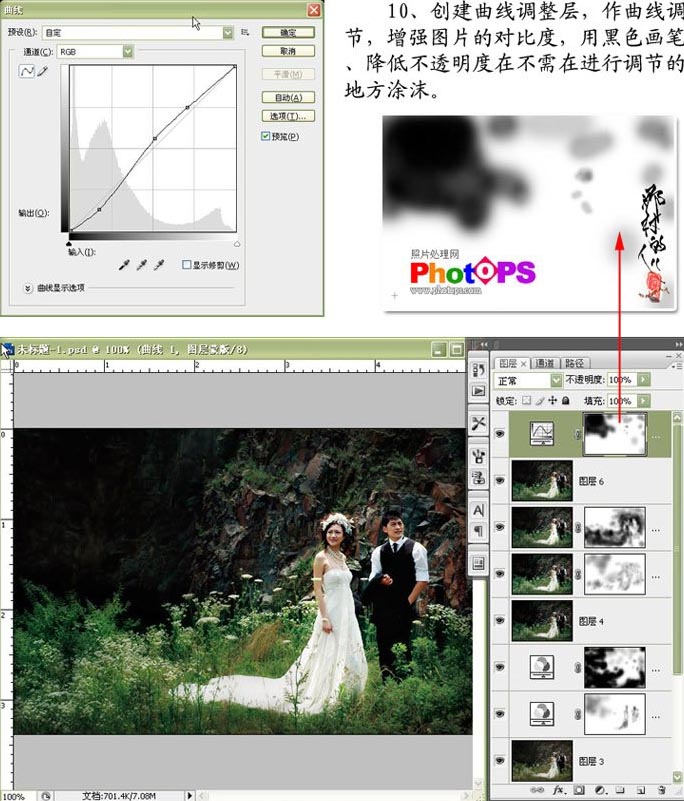 10.创建曲线调整层,做曲线调节,增强图片的对比度,用黑色画笔、降低不透明度在不需要在进行调节的地方吐沫。