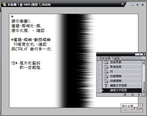 2.选中图层1,执行菜单:滤镜 > 风格化 > 风,选中大风,确定。执行:滤镜 > 模糊 > 动感模糊,数值为33,确定后按Ctrl F加强几次。效果如下图。
