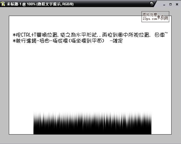 3.按Ctrl T变换位置,使之为水平形状,在拉到图中所视位置,回车。执行:滤镜 > 扭曲 > 极坐标(极坐标到平面)确定