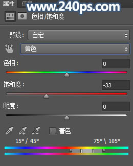4、创建色相/饱和度调整图层,对全图,黄色进行调整,参数及效果如下图。这一步降低主色饱和度。