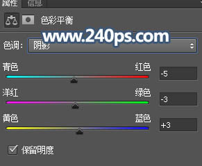 6、创建色彩平衡调整图层,对阴影进行调整,参数设置如下图,确定后创建剪切蒙版。这一步给暗部增加蓝色。