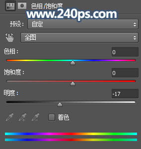 2、创建色相/饱和度调整图层,大幅降低全图明度,参数设置如下图,确定后按Ctrl + Alt + G 创建剪切蒙版。这两步给图片增加暗角。