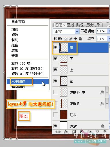 同样按Ctrl T调出自由变换工具。在变换框里点右键,选点“水平翻转”。