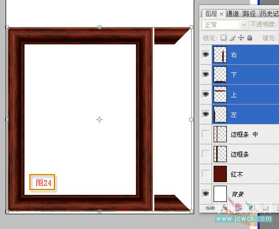 有必要时,把四条边框条全部点蓝,用自由变换工具框好,把它们缩小来擦,方能将上下二边框条在右边