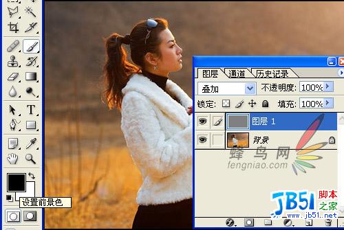好了,序幕即将拉开。选择大小合适的画笔,将前景色设置成为黑色或白色,然后我们的画笔就可以轻松地在“图层1”上涂抹了。如果前景色设置成为黑色,那么画笔在照片上经过之处都将变暗;反之,如果前景色设置成为白色,那么画笔在照片上经过之处都将变亮;如果您希望还原照片的原色,那么可以将前景色设置成为50%灰色,画笔在照片上经过之处将再现照片的原色。