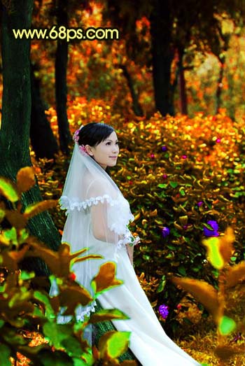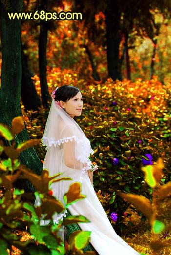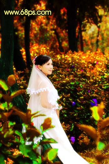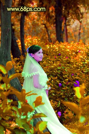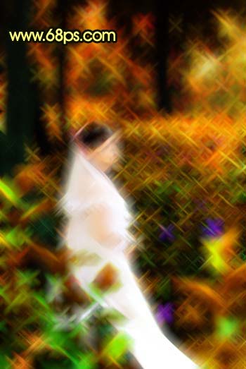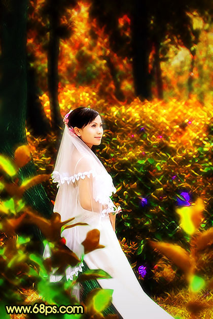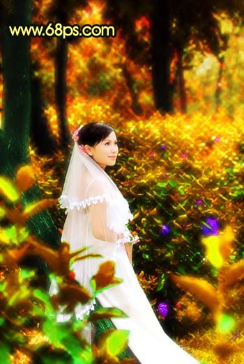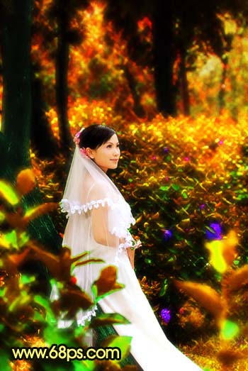 教程介绍梦幻婚片的制作方法。调色的时候先把背景部分调成暗红色,然后再单独出来人物部分。把两部分色彩调整差不多以后,就用滤镜效果制作一些梦幻星光即可。