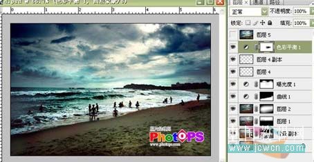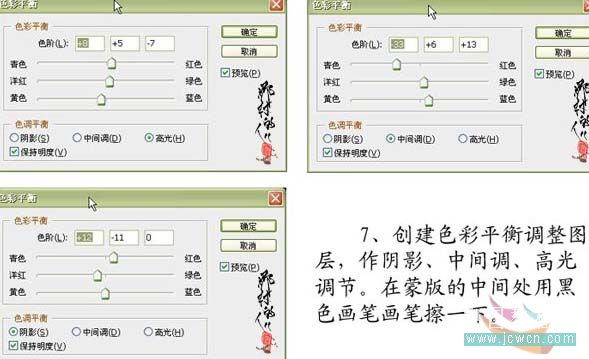 7、创建色彩平衡调整图层,作阴影、中间调、高光调节。在蒙版的中间处用黑色画笔擦一下。