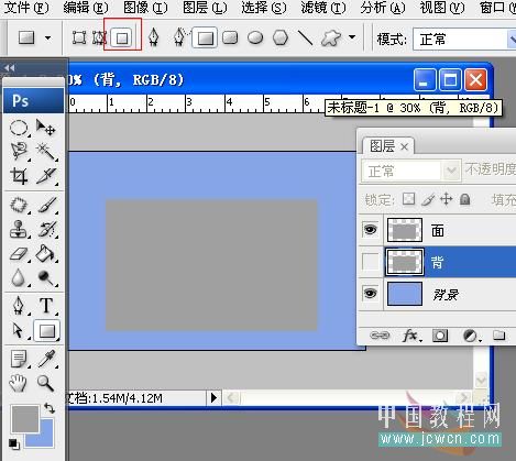 新建文档,背景色自定,新建一层,用矩形工具画一个矩形,(注意是路径工具组里的矩形工具,不是选择工具组里的矩形选择工具.前景色随便.我习惯用50% 中性灰)命名为"背".