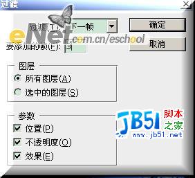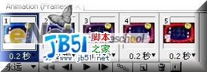 第十三步:新建一帧,背景颜色换成红色,其它不动,点击动画面板上动画过渡帧按钮,增加3帧,设置效果如[图18所示];得到5帧;设置选择帧延迟时间为0.2秒,得到效果如[图19]所示;