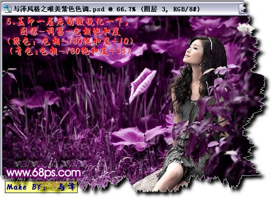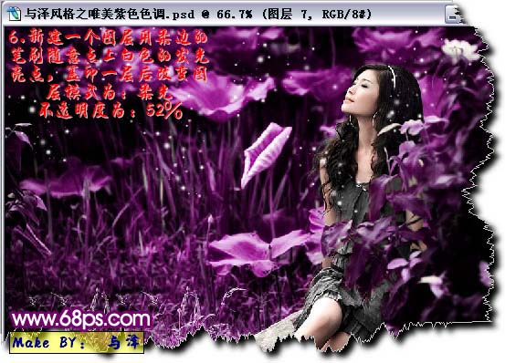 平面设计 > photoshop教程 > 照片处理 > Photoshop 调出照片的梦幻紫色调 2008-12-08 14:49:14 脚本之家 5、新建一个图层,盖印图层,适当的用Topaz滤镜锐化一下,再按Ctrl + U调整色相/饱和度,参数设置:绿色:色相:-180,饱和度:+10;青色:色相:-180,饱和度:+33。 6、新建一个图层,用柔边的笔刷随意点上白色的点。 7、最后加上文字签名,完成最终效果。 上一页 1 2 3 4下一页阅读全文