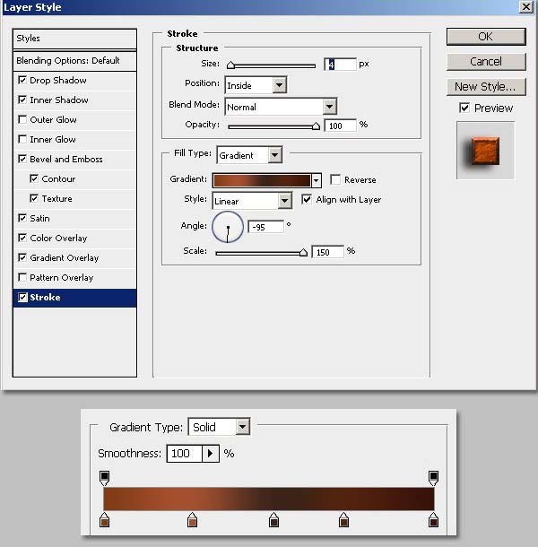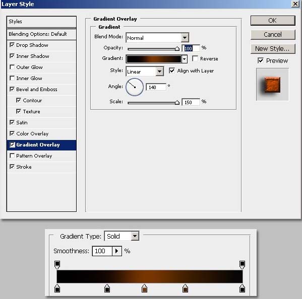 7、开始为文字添加图层样式:渐变叠加,选择【线性渐变】 ,设置有 【#000000, #160700, #783501, #421F01, #050505】 五种颜色的渐变 角度=140;描边 选择【渐变】 设置为【#803C17, #A44F30, #52230F, #52230F, and #381408】 五种颜色的渐变 角度=-95