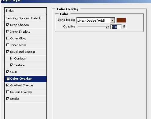 #p# 9、继续设置图层样式 【颜色叠加】 颜色=#742901, 模式=【线性减淡】 ,其他设置如图 ;【光泽】 黑色 , 模式=【正片叠底】,其他设置如图