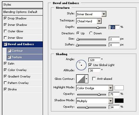 #p# 10、继续设置图层样式 【斜面和浮雕】 高光模式=颜色减淡 ,阴影模式=正片叠底 , 其他设置如图